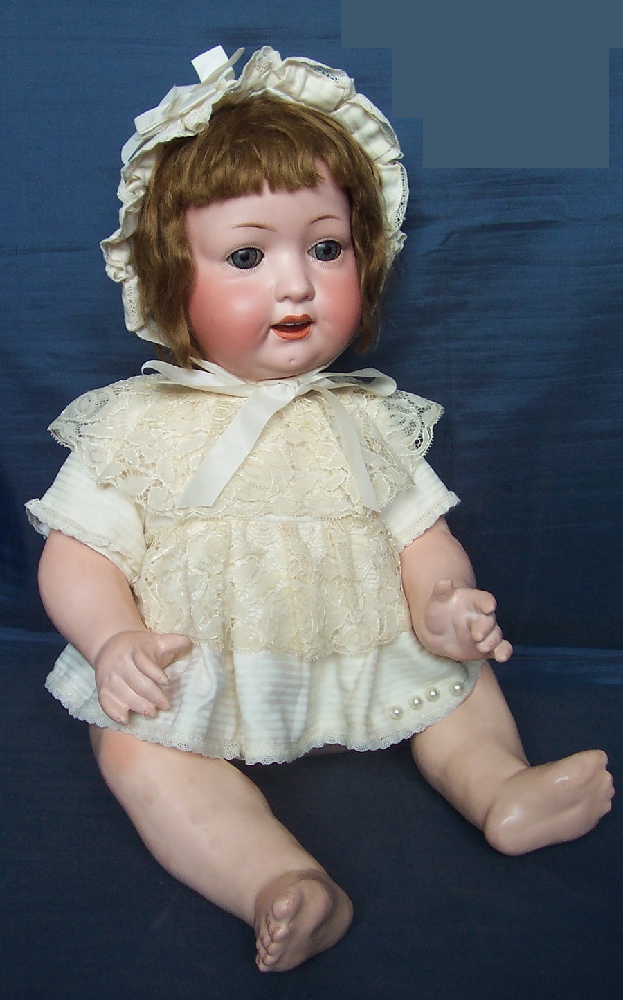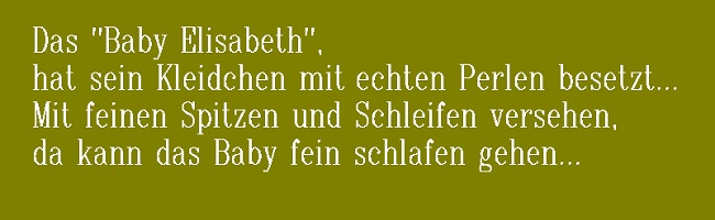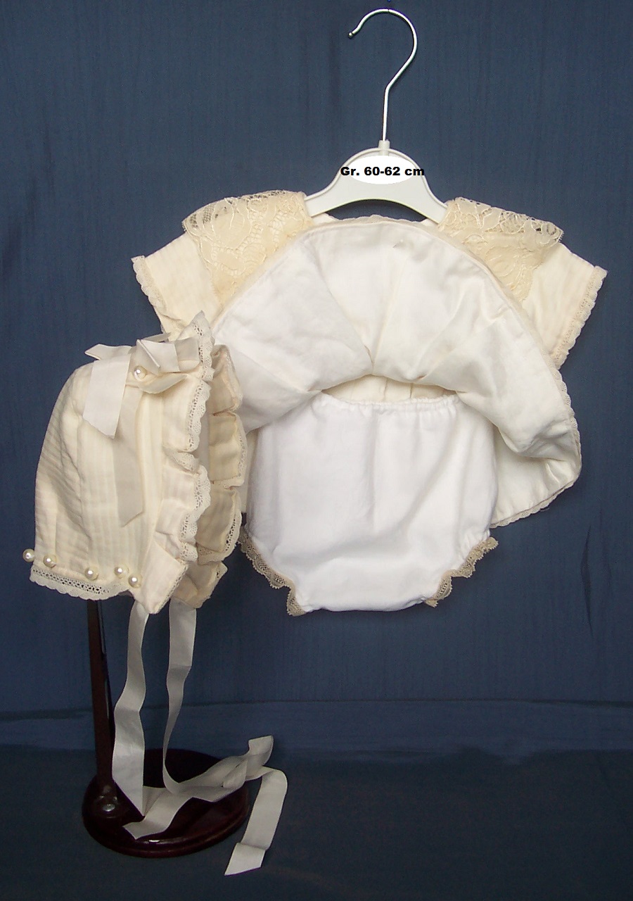 Die Babypuppengarderobe "Baby Elisabeth" besteht aus einem Kleidchen, einem Häubchen und einem Höschen. Die Garderobe ist aus einem original, antiken, rose- weiß, gestreiften Baumwollstoff gefertigt. An manchen Stellen ist der Stoff auf Grund des Alters verblichen und die rose Farbe erscheint eher gelblich. Unterlegt ist die Garderobe mit einem weißen, antiken Baumwollstoff mit integriertem Blumenmuster. Das Kleidchen ist mit halben Ärmel geschneidert. Von hinten ist es offen und mit Druckknöpfen durchgehend zu bedienen. Verziert ist das Kleid mit großen Volants aus einer kostbaren Seiden-Plaunerspitze . Zum kurzen Kleidchen gibt es das Windelhöschen aus dem weißen Baumwollstoff mit integriertem Blumenmuster. Die Hose ist mit Gummibändern an Bund und Hosenbein dehnbar. Die Kopftracht ist passend zum Kleidchen gestaltet und wird unter dem Kinn mit einem Seidenband gebunden. Abschließend zieren cremefarbende, antike Baumwollspitze, echtes Seidenband und echte Perlen, die von einer antiken Halskette stammen das "Baby Elisabeth".