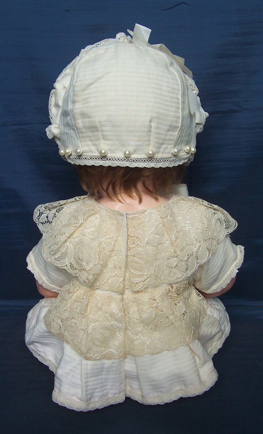 Finally a cream collor cotton lace, pure silk band and real pearls garnish the "Baby Elizabeth".