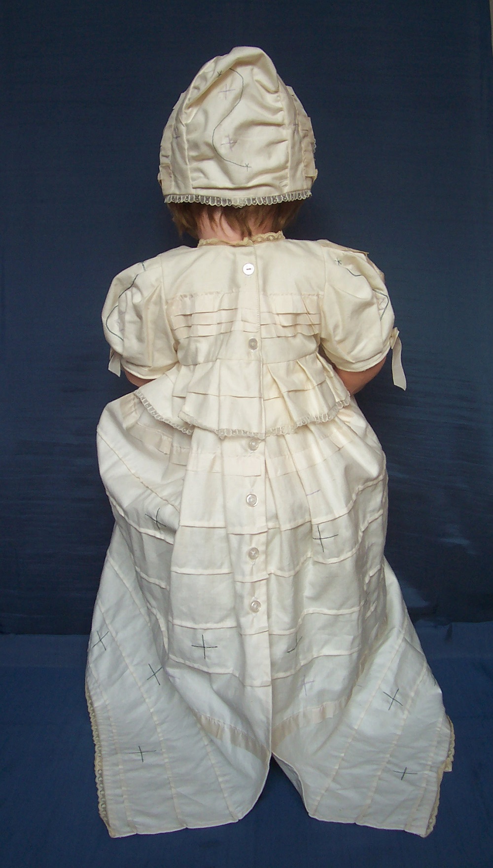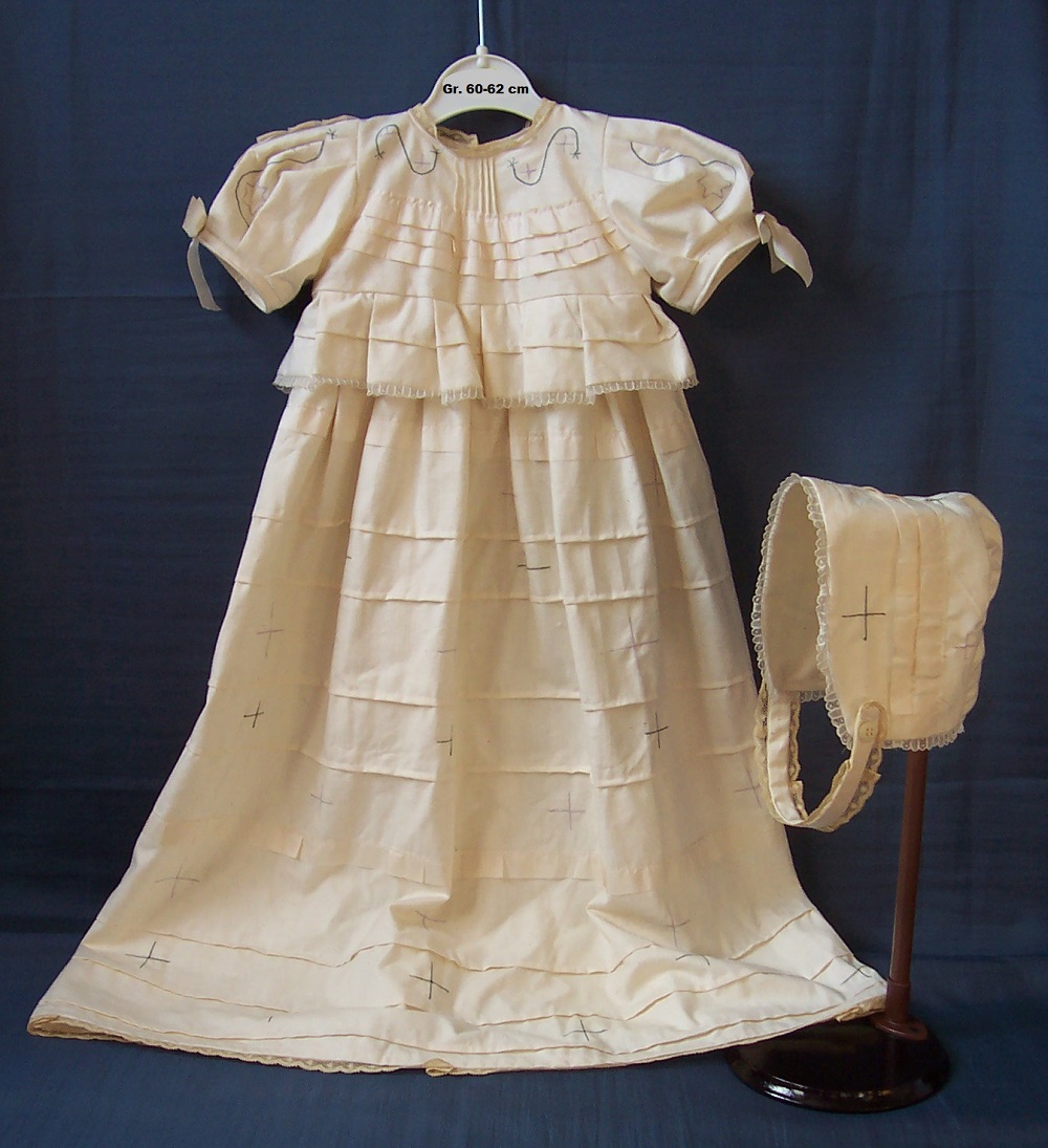 Die Taufgewandung besteht aus einem langem Kleid und einem dazu passendem Häubchen.