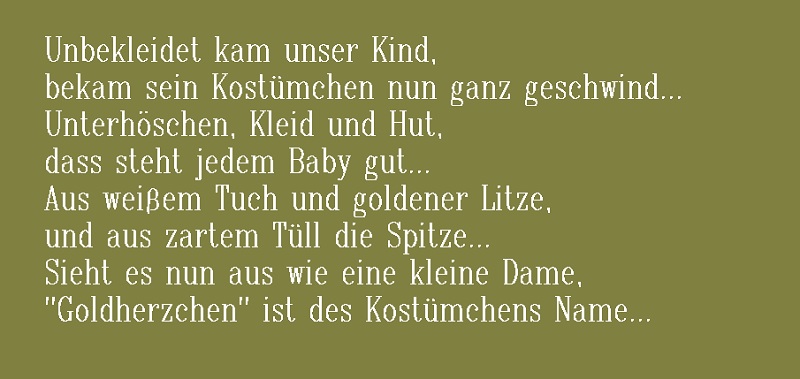 Die Garderobe " Goldherzchen" besteht aus einem kurzem Kleidchen, mit einem Haubenhut und einem Unterhöschen.