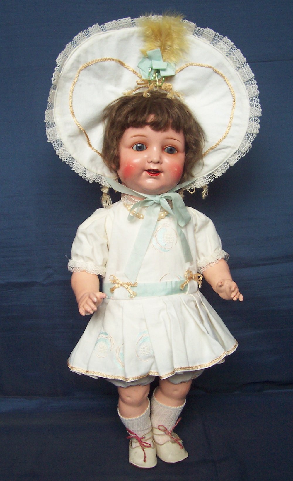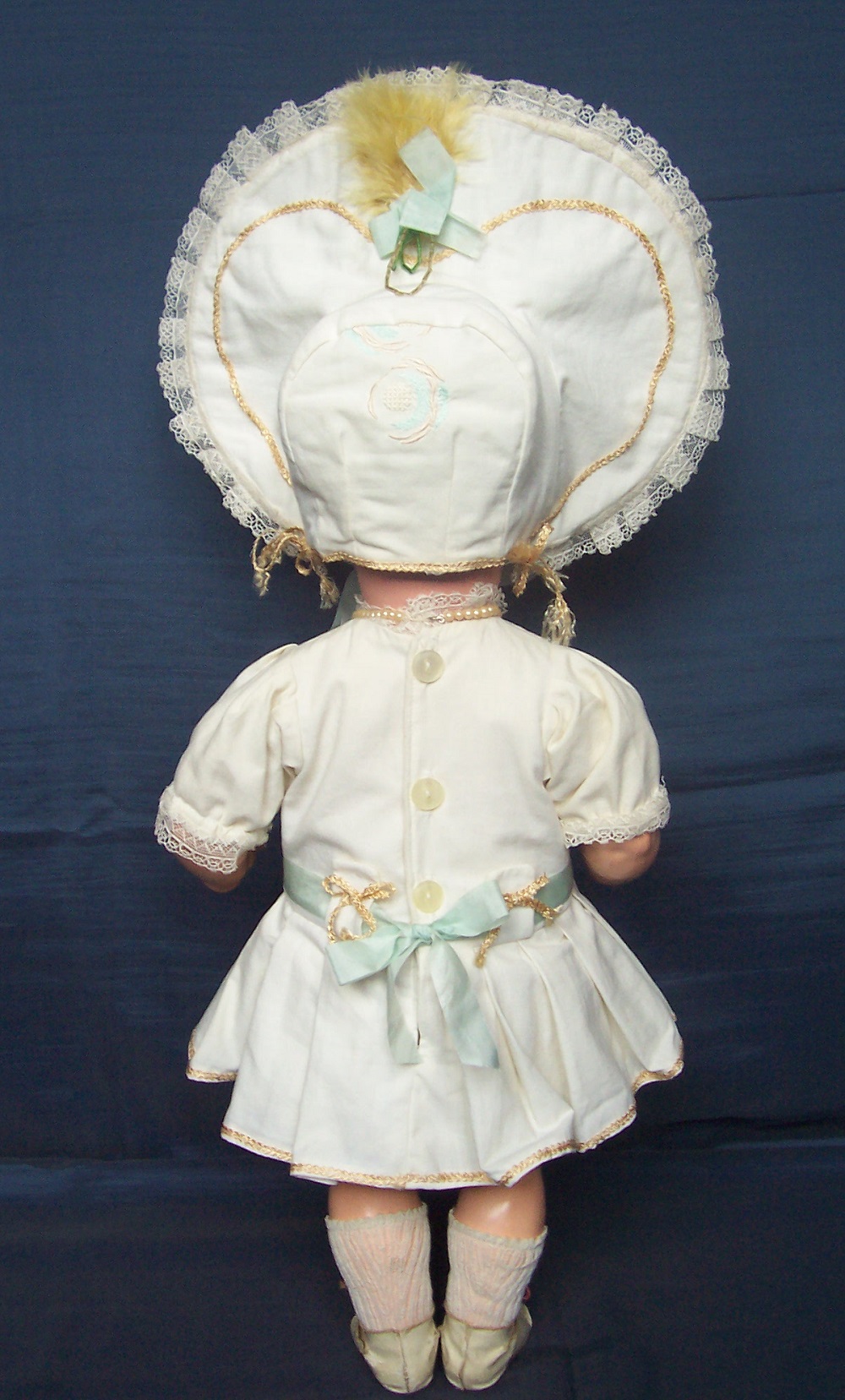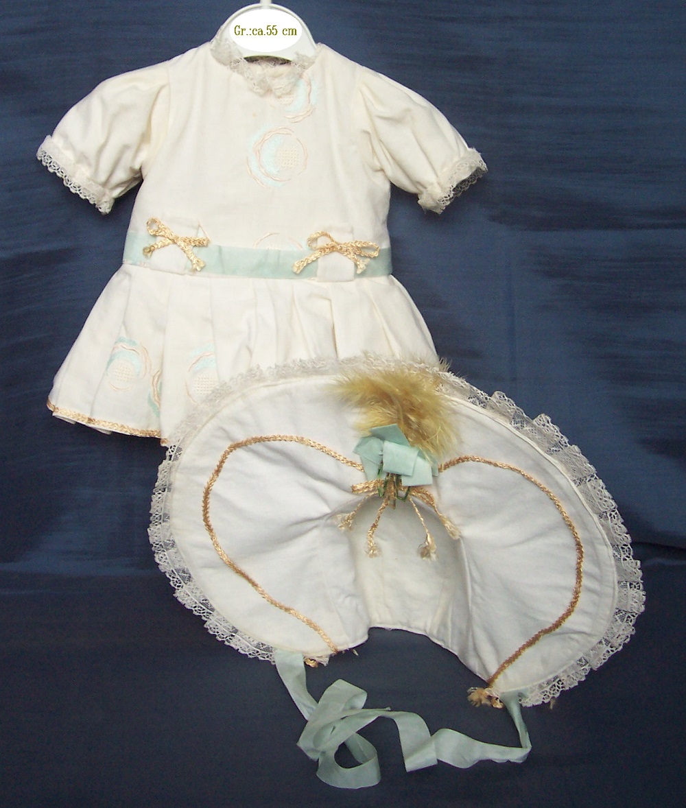 The costume "goldheart" consists of a short dress with a bonnet and panties. The ensemble is made of an ancient, white cottonfabric with delicated maschine-embroidery pattern. The fabric steam from old property. The dress is design with pump sleeve, short plateskirt with belt-loops. It is complete lining with an antique finelinnen-fabric. The babydress sits stuff, because of the lining linnenfabric and is decorated with a delicated, ancient tulle-lace, goldencolour silkbanderole and a fine, ancient silk-ribbon. The dress is behind to close with old buttons and button-holes. The panties is made of the ancient linnenfabric. The leghem is decorated with the goldencolour silk-band and is made pump with gum. The bonnet is lining and is made stuff with a hatwire. It is match decorated to the dress with the fine tullelace and the goldencolour silkbanderole. The hatgear is garnished with delicated Marabufeather and with delicated, ancient glas-pearls, a fine handmade of guatemala and fine silkribbon. It is to bind under the chin with the fine silk-ribbon to bow. The ensemble fits an ancient baby- or Toddlerdoll of around 55 cm (22").