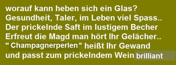 Das Kostüm "Champagnerperlen" besteht aus einem Kleid mit passender Kopfbedeckung. Das Model ist aus einem Seidenmischgewebe im Farbton "Champagner" gearbeitet. Das schimmernde Material in Kombination mit den antiken, hauchzarten, Leinenspitzen erinnert uns an ein prickenldes Glas "Champagner" daher entstand der Name "Champagnerperlen".