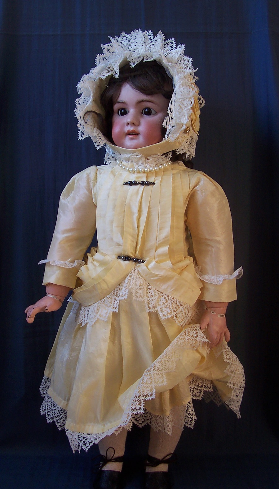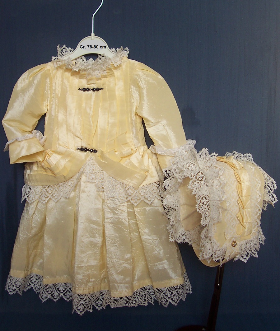 The costume "Champagner pearl" includes a dress with matching cap. The model is made from silk mix material in color champagne. The shining material, in combine with an antique, tiny linen lace, remind us on a glas of champagne. The dress pleated front is trimming with black shining glas pearls in different size, looks like two brouche. The dress skirt is wearing an integrate under skirt. The under skirt is made from tulle with champagne hem. The dress is to close from back with vintage gold color buttons. The matching bonnet is made from same material. Under the chin to close with the nostalgic gold buttons with integrate transparent glas stone. The costume "Champagne pearl" fits an ancient doll or reproduction of 78-80 cm (30"-31").