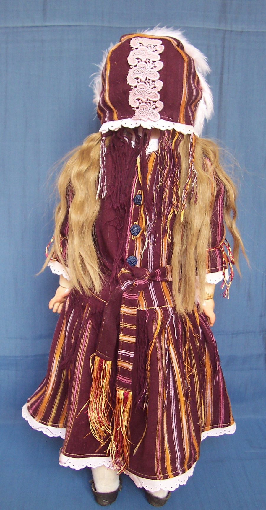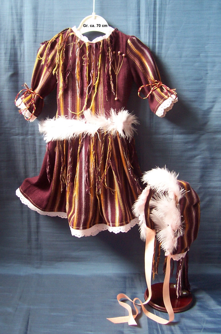 Das Unikatpuppenoutfit "Hexe Fransi" besteht aus einem Kleid mit passendem Kopfputz. Das Kostüm ist aus einem antikem Seidengewebe gefertigt, das einst in Indien gewebt wurde. Der weinrote Farbgrundton ist mit leuchtendem Streifenmuster in orangegelb, rosa und weiss versehen. Das Hexenkleidchen ist mit engem Ärmeln, freiem Kragen und langem Rock designt. An Kragen und Rock befinden sich lange Fransen. Um die Taille verlaufen rosafarbene flauschige Marabu Federn. Hinten sitzt ein Taillenband mit Fransen, das zur Schleife gebunden wird. Um Kragen, Ämel- und Rocksaum schliesst eine rosa Baumwolllochstickreispitze ab. Zum Knöpfen des Kleides dienen hinten dunkle Kunststoffknöpfe in Rosenform. Ein Besen aus goldfarbigen Seidengarn gestickt an altrosa Steinperlen ziert noch die Kleiderbrust. Das Mützchen ist passend mit Fransen abgesetzt. Um den Gesichtbereich verlaufen rosa Marabu Federn die duch weiße Glasperlen gezogen sind. Ein antikes Accessoire aus altrosa Tüllspitze ziert hinten noch die Haube. Unter dem Kinn wird die Kopftracht mit einem orange-rosa Seidenband zur Schleife gebunden. Das Kostüm ist für eine ca. 70 cm großen, antiken Glieder- oder Lederbalgpuppe gefertigt.