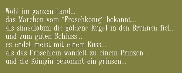 Das Kostüm "Der Froschkönig" besteht aus einem langen, biederen Kleid und einer Kopfbedeckung. Die Garderobe ist aus einem antiken, hellblaufarbigen Baumwollstoff gefertigt, der mit transparenten Blumenornamenten versehen ist . Das Kostüm ist komplett mit einem antiken, weißen Baumwollstoff unterlegt. Eine delikate, antike Seidenbanderole schmückt den Brustbereich des Kleides und die Haube. Akzentuiert ist das Outfit mit feinen, antiken Tülllitzen und vorne an der Scherpe mit feinsten Perlen. Das Kleid ist mit altertümlichen Keulenärmeln designt und wird von hinten mit Druckknöpfen geschlossen, die mit zarten Glaswachsperlen geschmückt sind. Das Häubchen ist am Hinterkopf mit Vliesline ausstaffiert und ist mit zarten Accessoires abgestimmt. Der Kopfputz wird unter dem Kinn mit Seidenschleife gebunden.