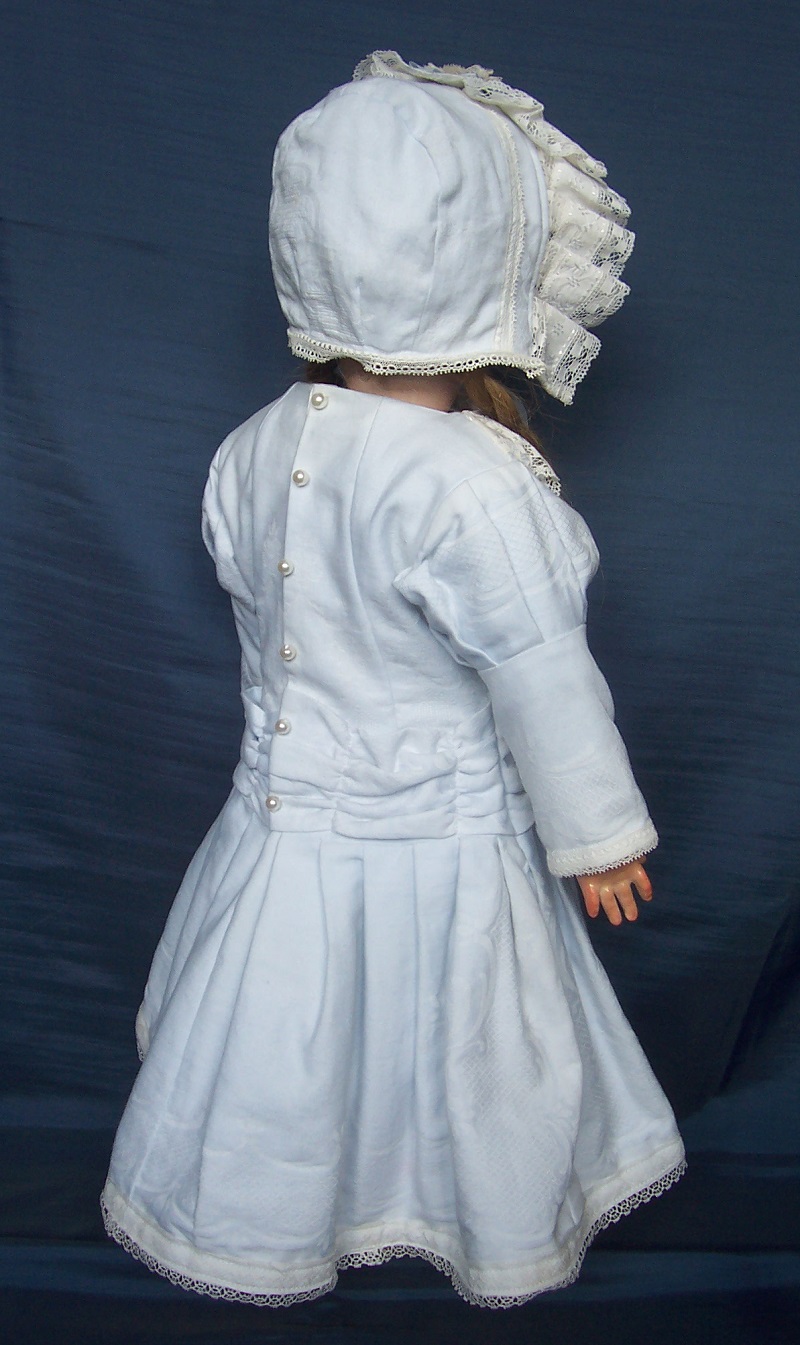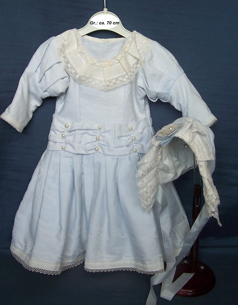 Die Garderobe ist passend für eine ca. 70 cm großen, antiken Puppe. The costume "The frogking" consists a gentle dress and a matching bonnet. The outfit is made of an ancient, pale-blue cotton-farbic, that is accentuated with a transparent flower-pattern. The outfit is complete lining with an ancient, white cotton-fabric. The ensemble is decorated with a fine, ancient silkbanderole in chest-area and is garnished the bonnet. The outfit is accentuated with fine, ancient tulletip and the dress sash adorned fine, real pearls. The dress is design with the antiquity mace-sleeve and is behind to close with push-button, they are adorned with delicated glaswaxpearls. The bonnet is lining with starch and is accentuated with delicated accessoires . It is to bind under the chin with a silkribbon. The outfit is fitting for an antique-doll of around 70 cm (around 27")