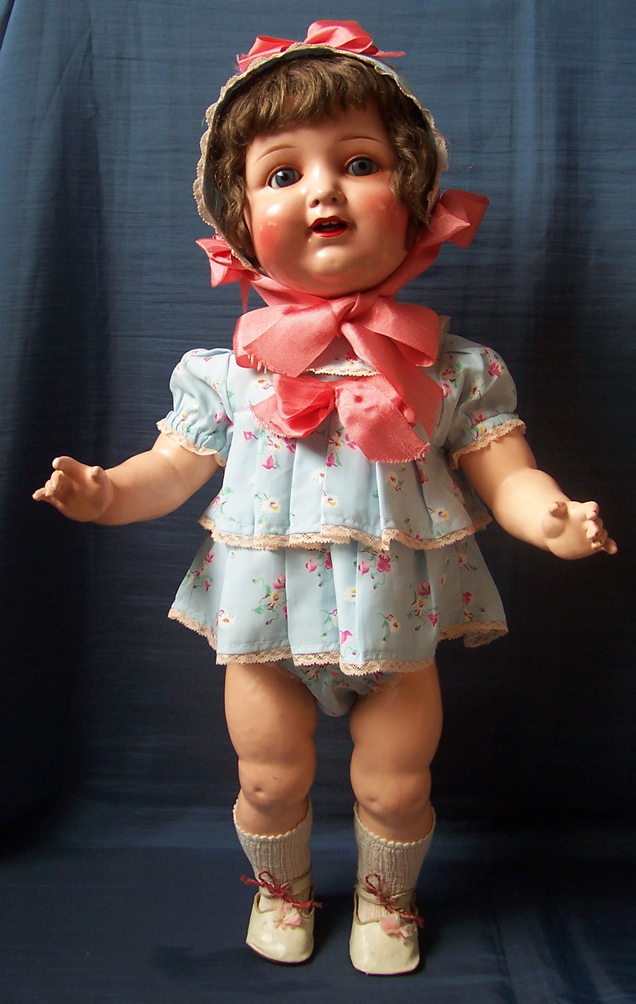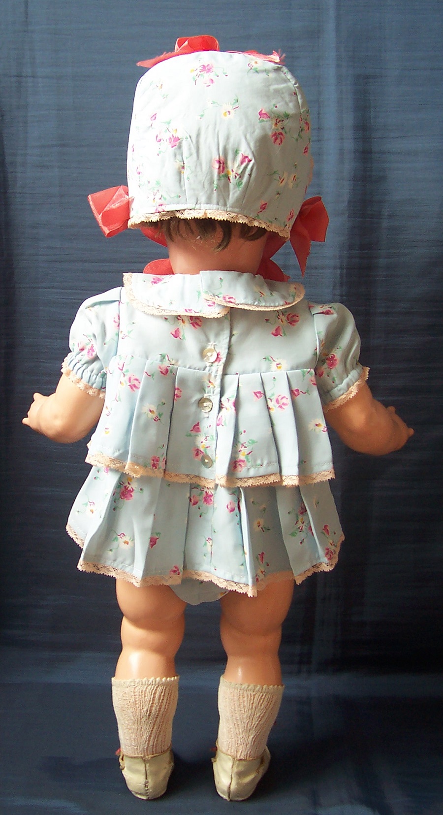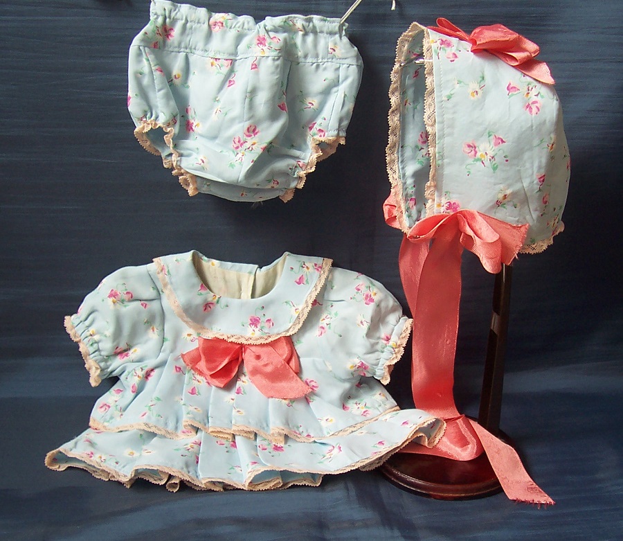 Die Babypuppengarderobe besteht aus einem Kleidchen, einer Haube und einem Windelhöschen. Die Kleidung ist aus einem antikem Naturfaser-Seidentaftstoff mit Mille fleur Muster gefertigt im Grundton "hellblau". Das Ensemble ist mit feinem Baumwollbatiststoff unterlegt. Geschmückt ist die Garderobe mit lachsrosafarbenen, antiken Tüllspitzen und mit wundervollem, antiken, breiten, korallenroten Seidenbändern. Das kurze Babykleidchen ist mit kleinem Rundkragen und mit zwei Volants am Rockteil gearbeitet. Die kurzen Pumpärmel sind mit verstecktem eingearbeiteten Gummi im Bund. Von hinten ist das niedliche Kleidchen mit winzigen echten Perlmutknöpfchen zum schließen. Die Haube ist passend mit der zarten Tüllspitze umrandet und unter dem Kinn mit dem Seidenband zum binden. Das Windelhöschen hat oben im Bündchen einen Gummizug eingearbeitet. Die Hosenbeinchen sind mit Spitze umrandet und mit verstecktem Gummibändchen im Saum. Das Outfit ist passend für ein 55-60 cm großes, antikes Puppenbaby. Aus diesem wundervollen Stoff gibt es 3 Unikatgarderoben. "Baby Melanie" mit korallen roten Akzenten, "Tinette" mit pastell grün-rose Akzenten und "Minette" mit rosa Akzenten. The baby costume includes a dress, a hood and a panties.