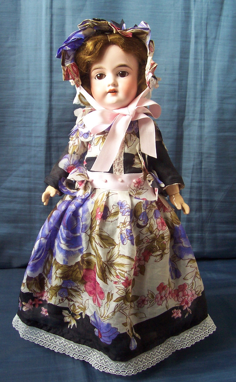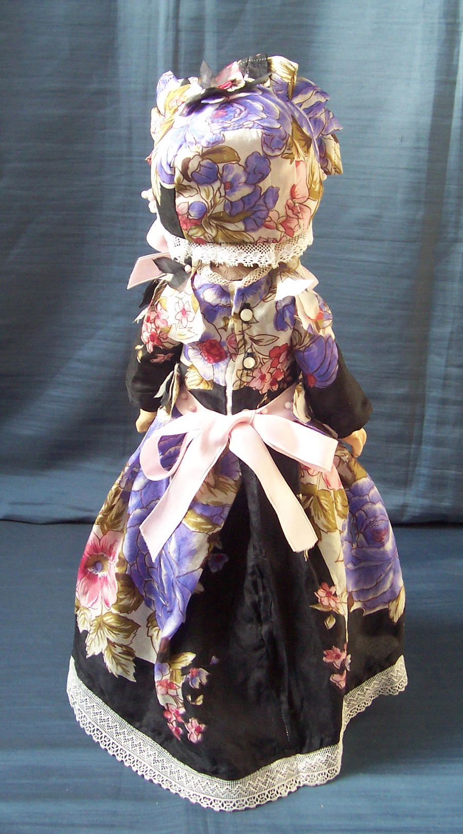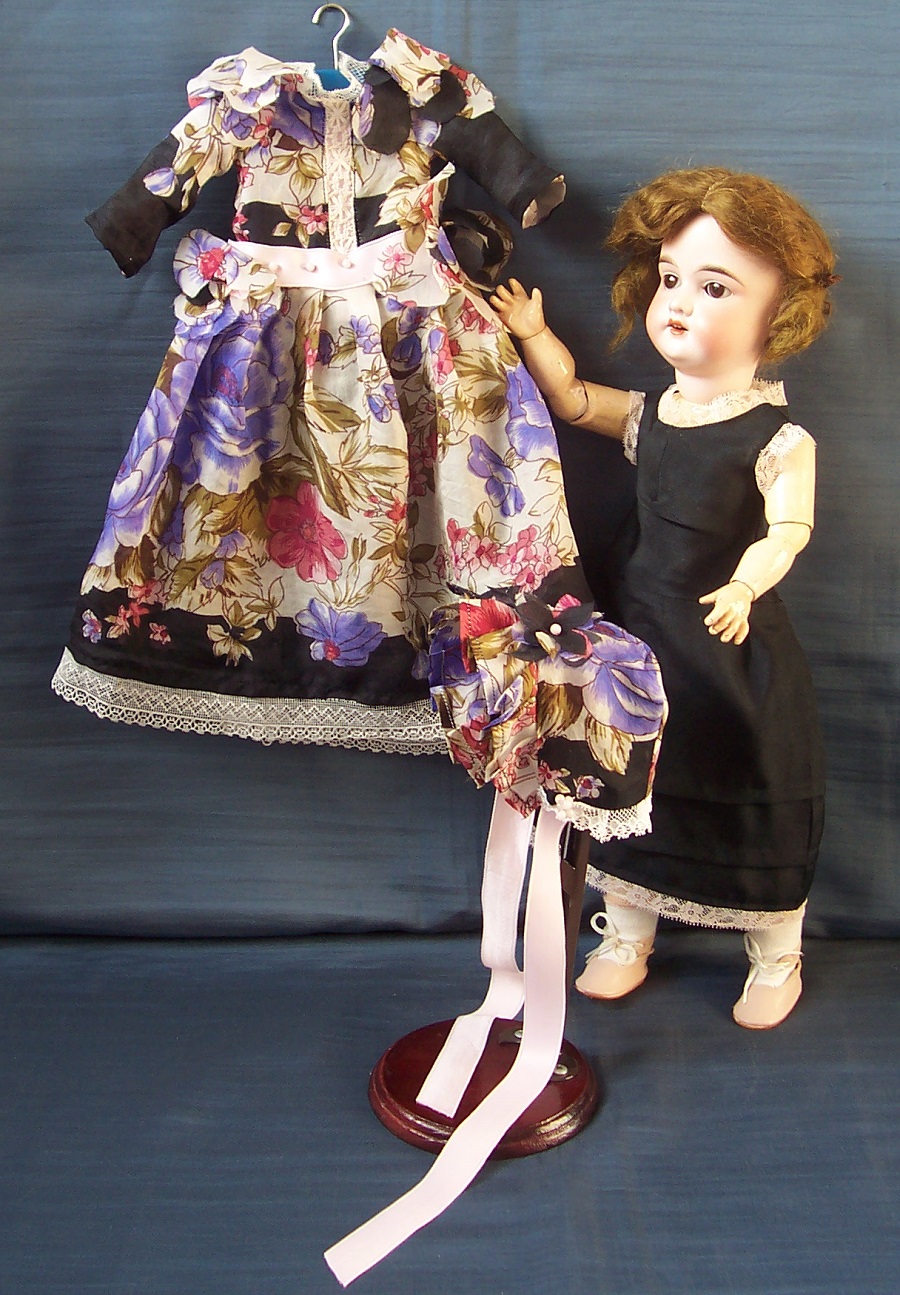 The outfit "easterflowers" consists a long, gentle dress with an underslip and a bonnet. The costume is made of an tender, fine silkfabric. The basiccolor is black with an intergrated colorful flowerpattern. The dress is design long with pipesleeve. Around the waist is garnished a palepink silkband that is behind to close with a bow. The dress is decorated on shoulder and on the waist with selfmade flowers made from the silkfabric. With tender, fine glaswax-pearls and on the collar and on the dresshem with delicated tullelace. From behind the dress is to close with glasbuttons and buttonhole. The bonnet is match decorated to the dress and is to bind under the chin with the palepink silkband to bow. To the costume belongs the match underslip made of black silksatin and garnished with fine tullelace. The costume is suitable for a 37-40 cm (16 inch) high antique doll.