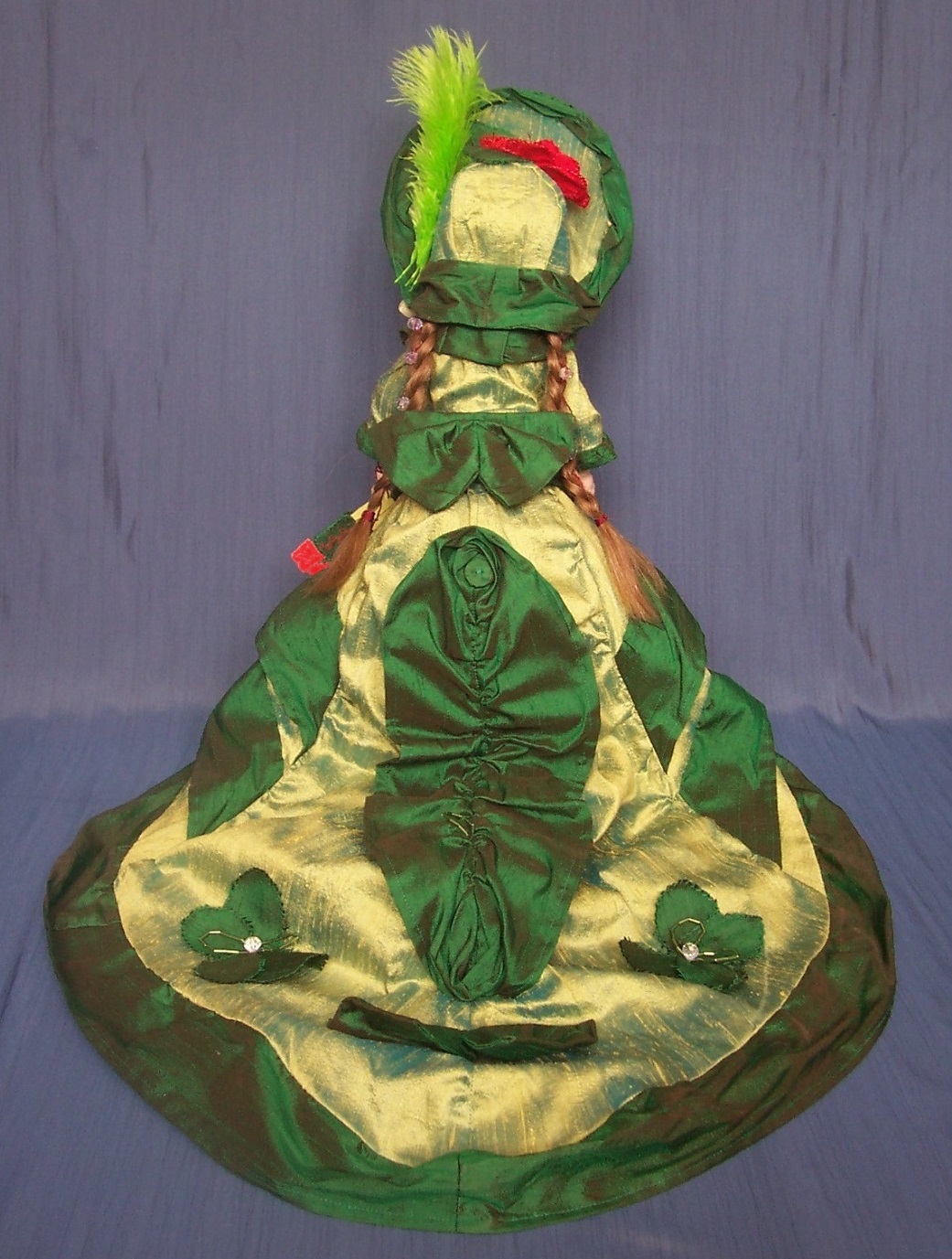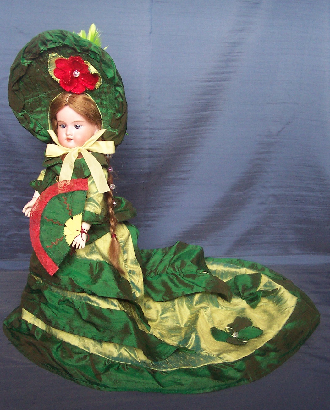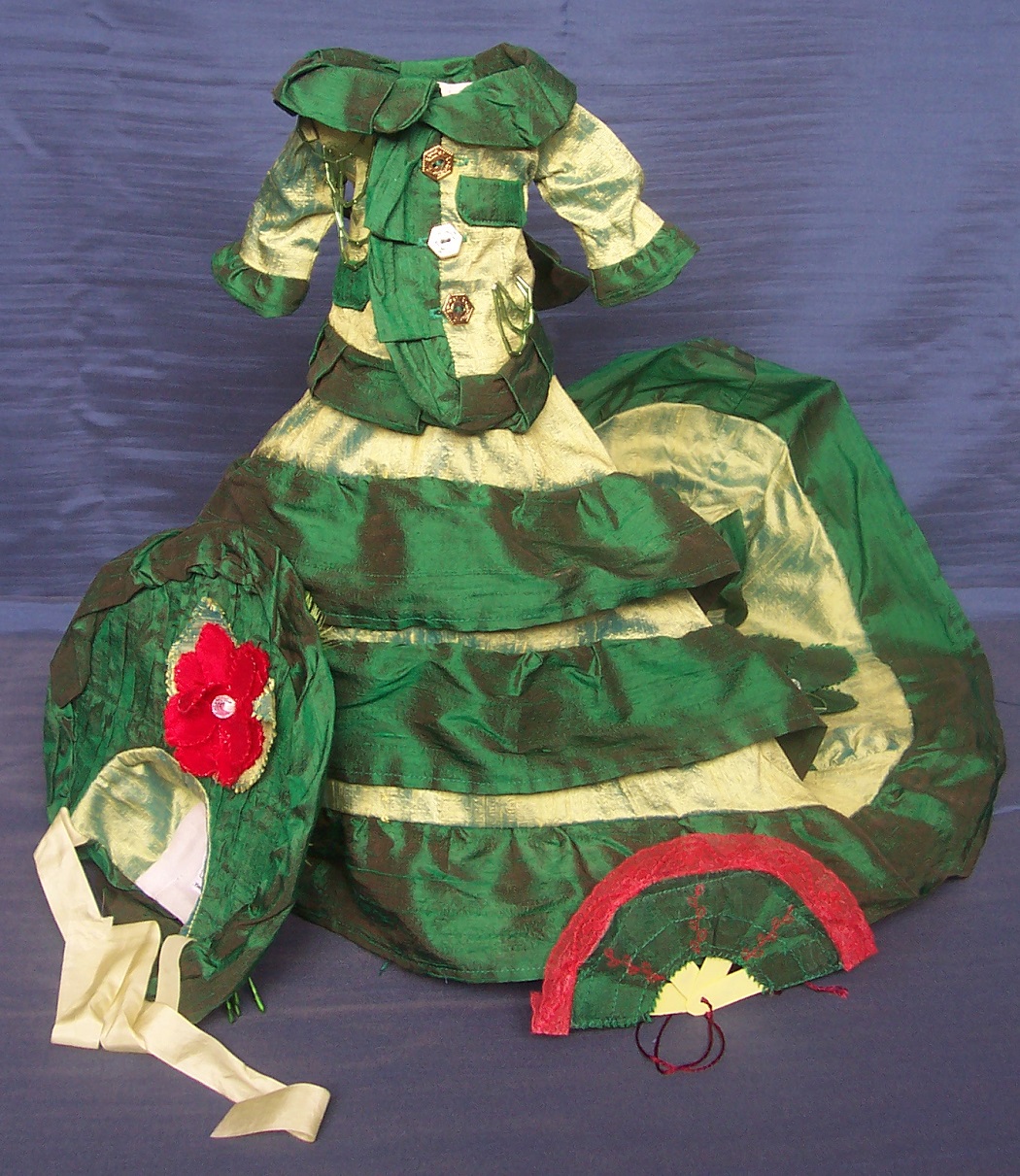 The outfit "vert ver a soie" Haute couture is tailored in French, antique fashion style. The costume is made of two green tones Dupioni silk and completely lined with a fine fabric. The ensemble includes a jacket, a skirt, a hat and a fan. The long drag skirt can be pinned up with a small chain of green glass beads, fine handcrafted from Guatemala, to a silk covered button. The skirt is buttoned with two old bulletglass buttons and a push button to operate. The jacket with two pockets is to closed in front with gold-colored brass buttons in antique style. The clothes are decorated with self-designed silk flowers, - silk butterflies, glass bead chains, bows and ostrich feathers. The little fan is created out of little cut plastic stripes. Painted and ganish with silk and lace. The lace was colored red. The ensemble is suitable for an antique doll of about 15"-16" (38-40 cm) in size.
