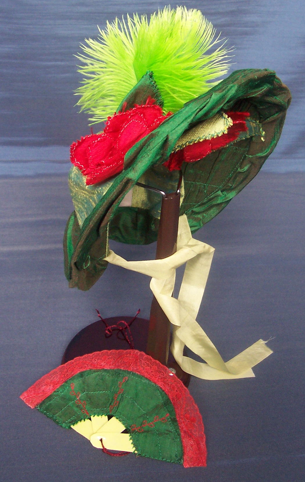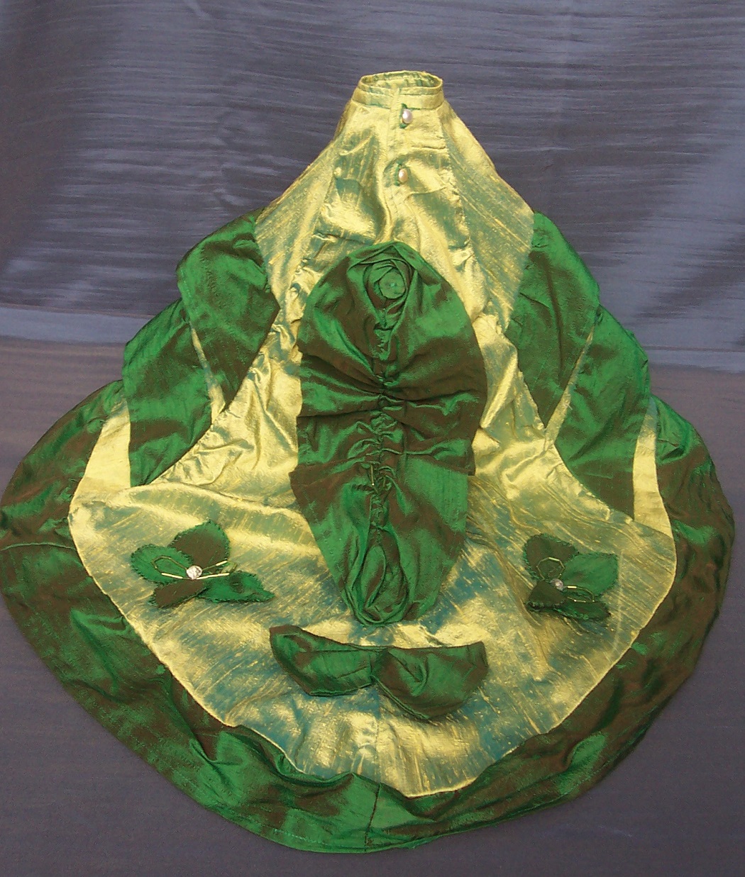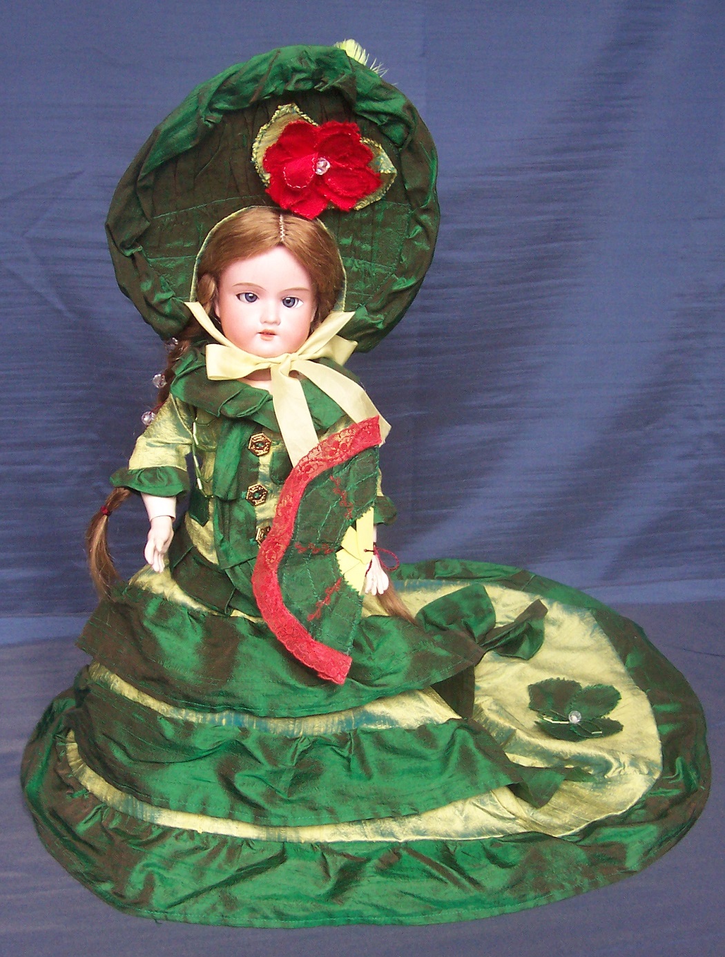 The outfit "vert ver a soie" Haute couture is tailored in French, antique fashion style. The costume is made of two green tones Dupioni silk and completely lined with a fine fabric. The ensemble includes a jacket, a skirt, a hat and a fan. The long drag skirt can be pinned up with a small chain of green glass beads, fine handcrafted from Guatemala, to a silk covered button. The skirt is buttoned with two old bulletglass buttons and a push button to operate. The jacket with two pockets is to closed in front with gold-colored brass buttons in antique style. The clothes are decorated with self-designed silk flowers, - silk butterflies, glass bead chains, bows and ostrich feathers. The little fan is created out of little cut plastic stripes. Painted and ganish with silk and lace. The lace was colored red. The ensemble is suitable for an antique doll of about 15"-16" (38-40 cm) in size.
