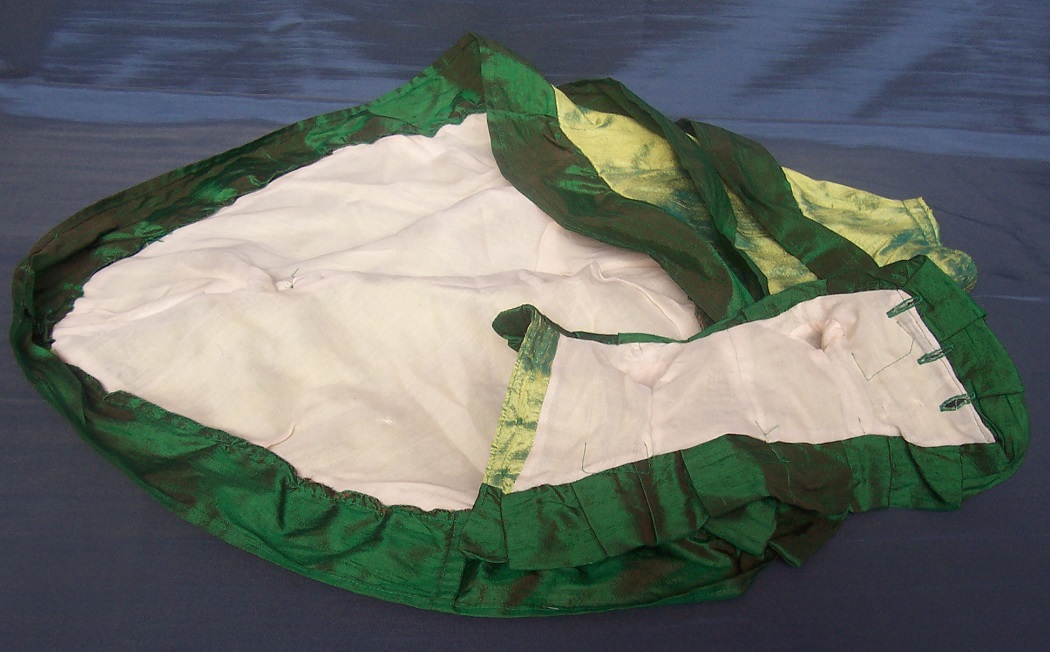 "Madame grüne Seidenraupe" ist im französischem, antikem fashion Stil geschneidert. Die Garderobe ist aus zwei grün Tönen Dupionseide gefertigt und komplett mit einem feinem Stoffgewebe unterlegt. Das Ensemble beinhaltet eine Jacke, einen Rock, einen Hut und einen Fächer. Der lange Schleppenrock kann mit einem kleinen Kettchen aus grünen Glasstabperlen, feine Handarbeit aus Guatemala, an einen seidenummantelten Knopf hochgesteckt werden. Der Rock ist mit zwei alten Kugelglasknöpfen und einen Druckknopf zu bedienen. Die Jacke mit zwei Taschen wird vorne mit goldfarbenen Messingknöpfen im Antikstil geschlossen. Verziert ist die Kleidung mit selbstgestalteten Seidenblumen, - Seidenschmetterlingen, Glasstabperlenkettchen, Schleifen und Straußenfedern. Der Fächer ist aus schmalen geschnittenen Kunststoffstreifen kreiert. Bemalt und mit Seide und Spitze benäht. Die Spitze wurde rot eingefärbt. Man kann ihn auch zuklappen. Die Garderobe ist passend für eine Antikpuppe von 38-40 cm Größe.