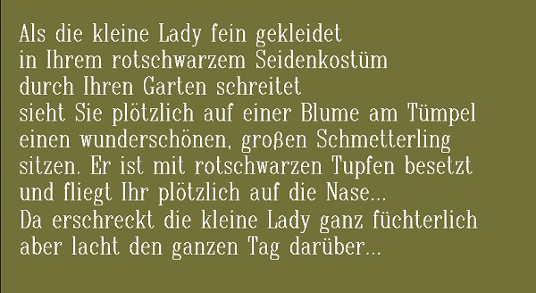 Das Kostüm "Madame rotschwarze Seidenraupe" ist im französischen Fashiondollstil geschneidert. Die Garderobe ist aus einem rotschwarzen Dupionseidenstoff gefertigt und ist komplett unterlegt. Das kleine Damenensemble beinhaltet ein Jacket, einen Schleppenrock, einen Haubenhut und ein Handtäschchen. Die Jacke ist mit selbstgelegten Rüschen umrandet und ist mit kleinen Brusttäschchen und hinten am Rücken mit Mantelband garniert. Von vorne wird das kleine Jacket mit schwarzen Kunsthartzrosenknöpfen, eine feine Handarbeit aus Guatemala und Knopflöchern geschlossen. Der Schleppenrock ist im vokuhila (vorne kurz hinten lang) Design gearbeitet und ist mit selbstgelegten Rüschen, Seidenblumenaccessoires, feinen Seidenschleifen und zarten Glasschliffperlen auf das Jäckchen abgestimmt. Der Rock wird von hinten mit schwarzem Seidenband- und Druckknopf geschlossen. Unter dem Rock wird eine Po-Stüze gebunden. Der Kopfputz ist passend zur Kleidung dekoriert und ist unterlegt gearbeitet. Die Haubenkrone schmücken schwarze Vogelfedern. Er wird unter dem Kinn mit schwarten Seidenbändern zur Schleife gebunden. Die kleine Handtasche kann geöffnet werden und wird über dem Arm durch ein altes Silberkettchen gehalten. Die Garderobe ist geschneidert für eine Antikpuppe von ca. 42 cm Gesamtgröße.