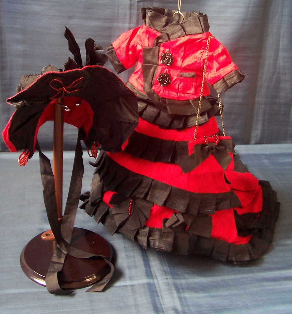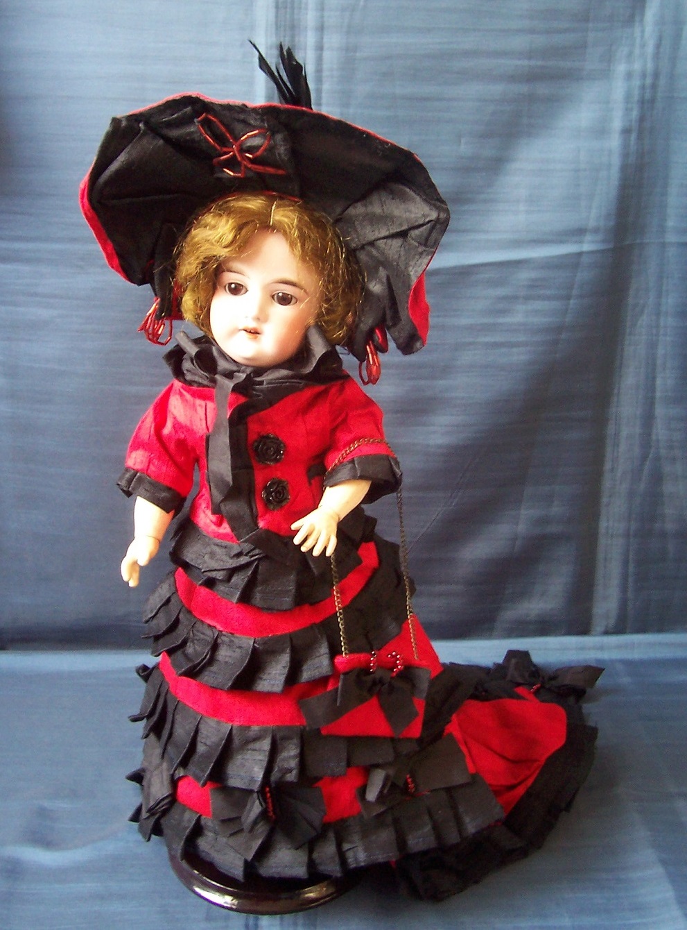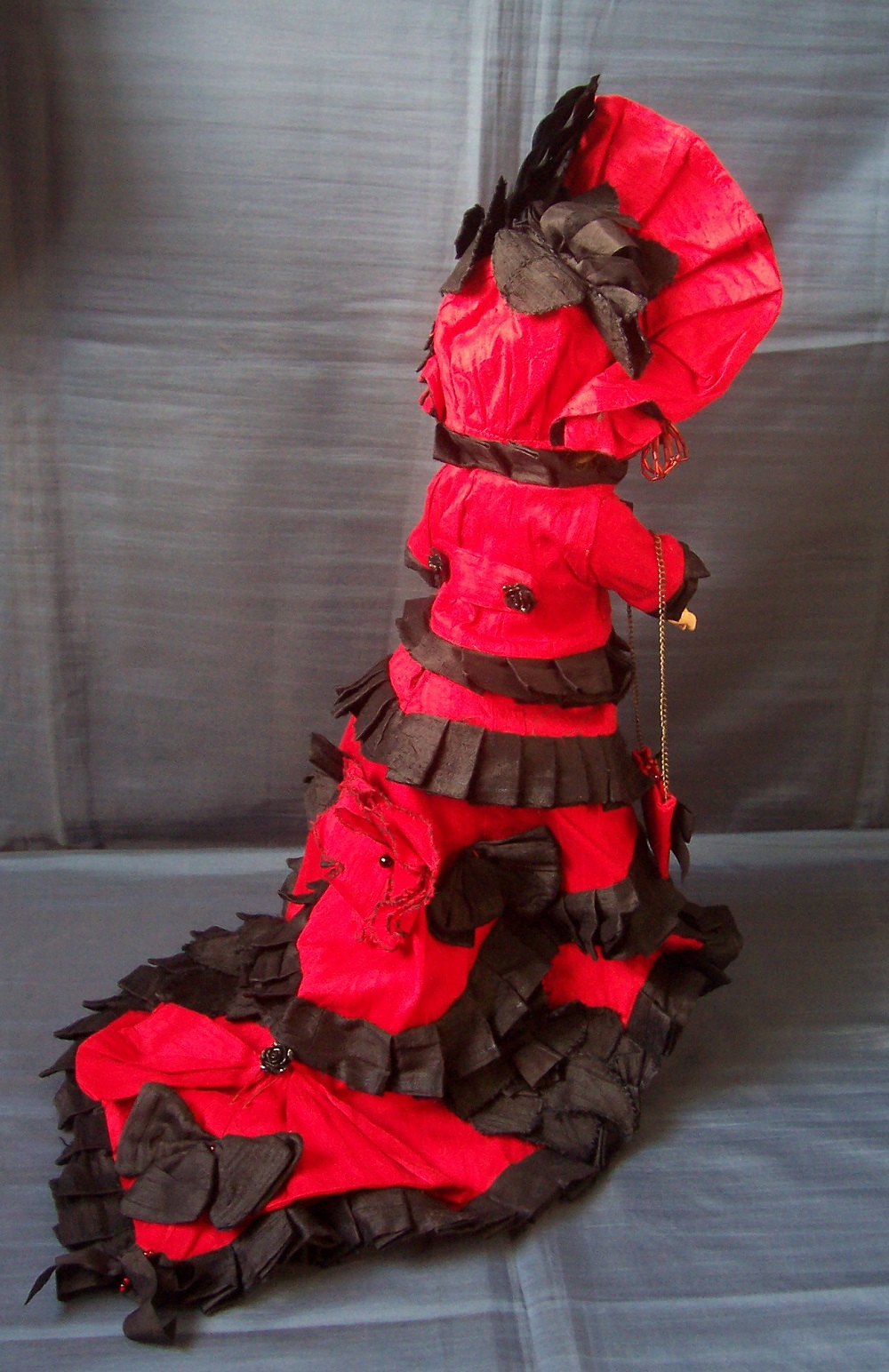 The costume "Madame redblack silkworm" is tailored in the french fashiondollstyle. The wardrobe consists of a red and black Dupion silk fabric and is completely underlaid. The small women's ensemble includes a jacket, a train skirt, a hat and a hand towel. The jacket is edged with self-laid ruffles. It is equipped with small chestbags and with a back coat tape. The small jacket is closed from the front with black artificial hard rose buttons, a fine handcraft from Guatemala and buttonholes. The train skirt is made in a vokuhila (front short back long) design and is match decorated to the jacket with self-laid frills, Silk flower accessories, fine silk bows and delicated glass pearls. The skirt is closed from the back with a black silkribbon- and a press button. The headdress is decorated to match the clothes. On the bonnet top is garnished black bird feathers. It is tied under the chin with black silk ribbons to a bow. The small handbag can be opened and is held over the arm by an old silverchain. The cloakroom is suitable for an antique doll in the size of around 40 cm. (around 16 in)