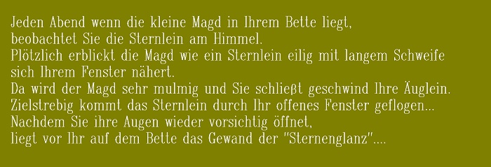 Gefertigt ist das Gewand aus einem original, antikem Feinleinen im Farbton "elfenbein". Dieser besondere Leinen ist noch aus Flachs, Hanf und Werg gewebt und wurde original um 1880 hergestellt. Beim Betrachten des Gewebes kann man die alte Webkunst erkennen. Akzentuiert ist die Kleidung mit feinster, antiker Tüllspitze und mit Rand geketteten, hellgrünen Seidenschleifen alles dem gleichen Zeitalter entsprechend. Den Kleiderkragen ziert ein Überwurf und feine Glas-Wachsperlen. Der Rock fällt in Biesen und Stickereien von Sternen in lila und dunkelgrün vollenden das Werk. Von hinten ist das Kleid mit Druckknöpfen zu bedienen. Der Hut ist doppellagig gearbeitet und unter dem Kinn mit dem leuchtend grünen Seidenband zum binden. Passend zum Kleid ist die Kopfbedeckung mit den Sternstickereien und Spitze verziert. Das Kostüm eignet sich für eine antike Puppe von ca. 75 cm Gesamtröße.