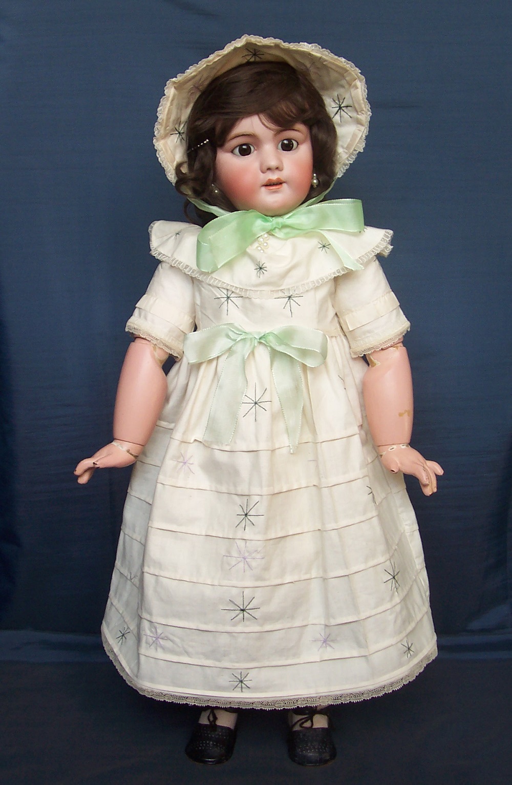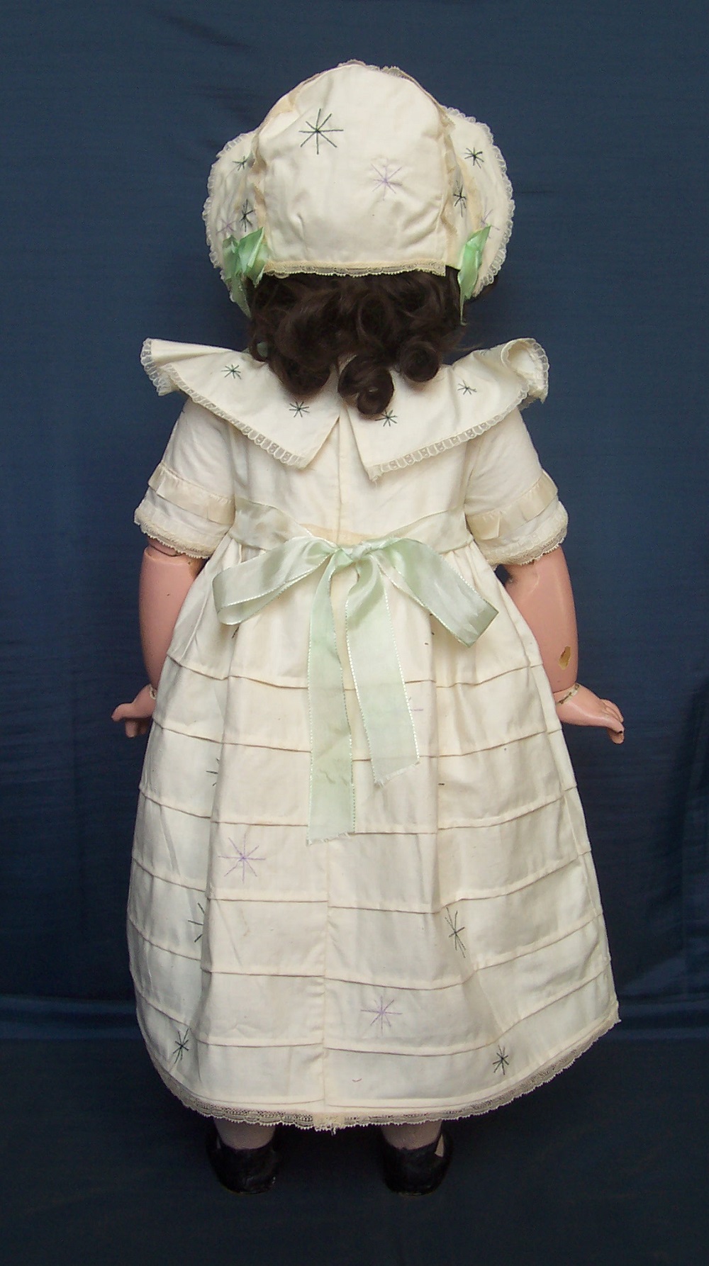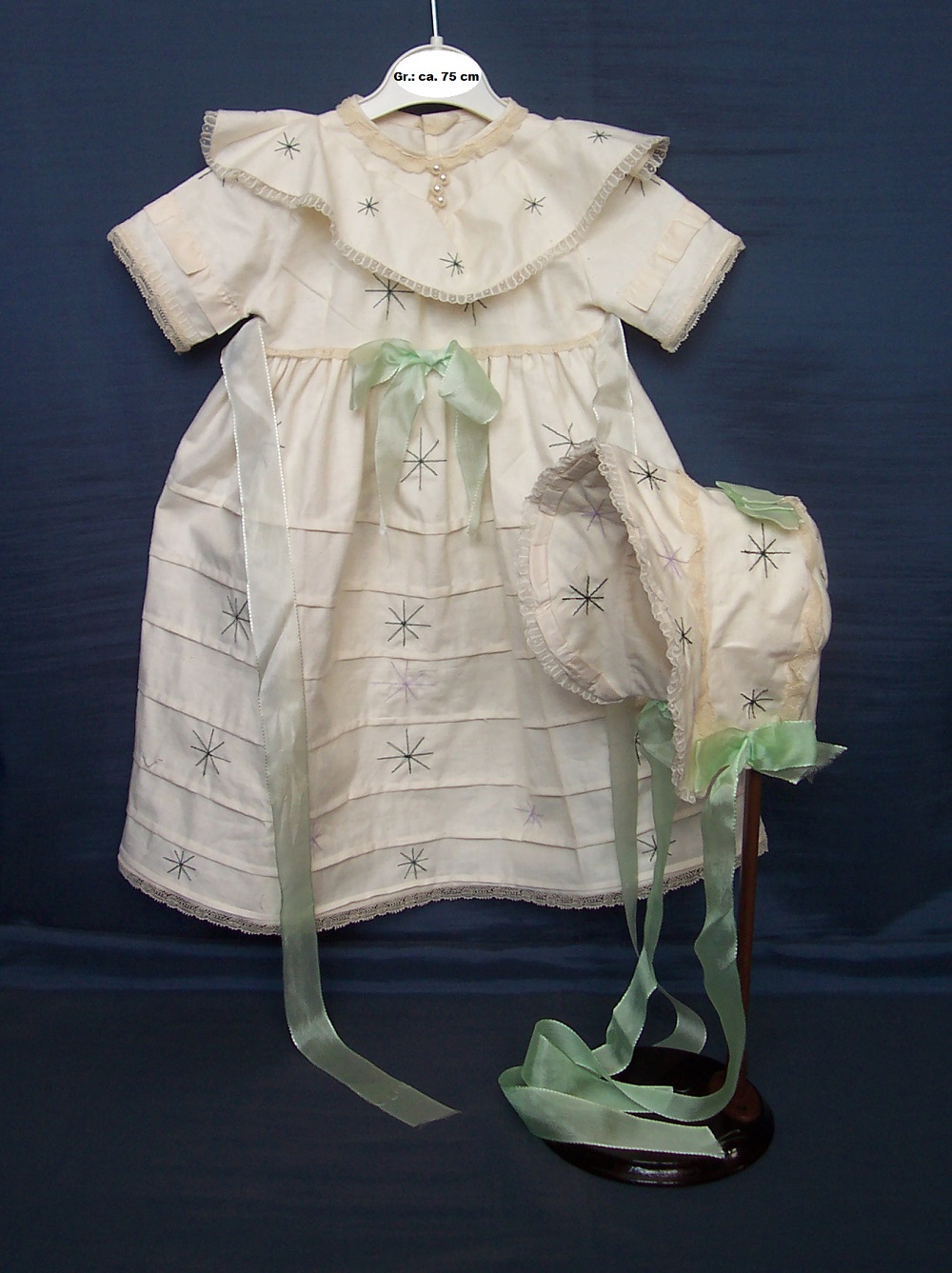 The costume "Star shine" includes a long hanging dress and a matching headgear. The ensemble is made out of an original, ancient, ivory color linen fabric. This fabric was original produced around 1880. You can watch the old handwork at the fabric. The dress collar is decorated with an over collar and big glas wax pearls. The gown is trimming with ancient tulle lace and light green silk ribbon produced in the same age. violet and dark green star formed embroideries finished the costume. The dress is to close from back with snaps. The bonnet is lining and under the chin to bind with the big green silk band. Matching garnished to the dress with tulle lace and star embroideries. The wardrobe fits an ancient doll around 75 cm ( 29,5").