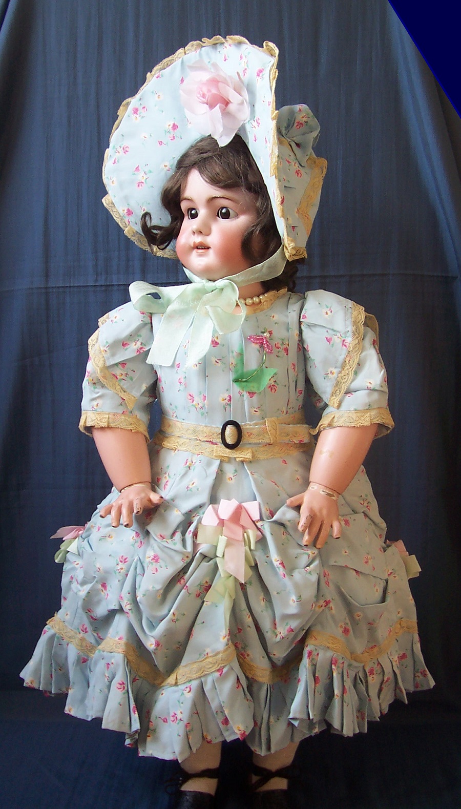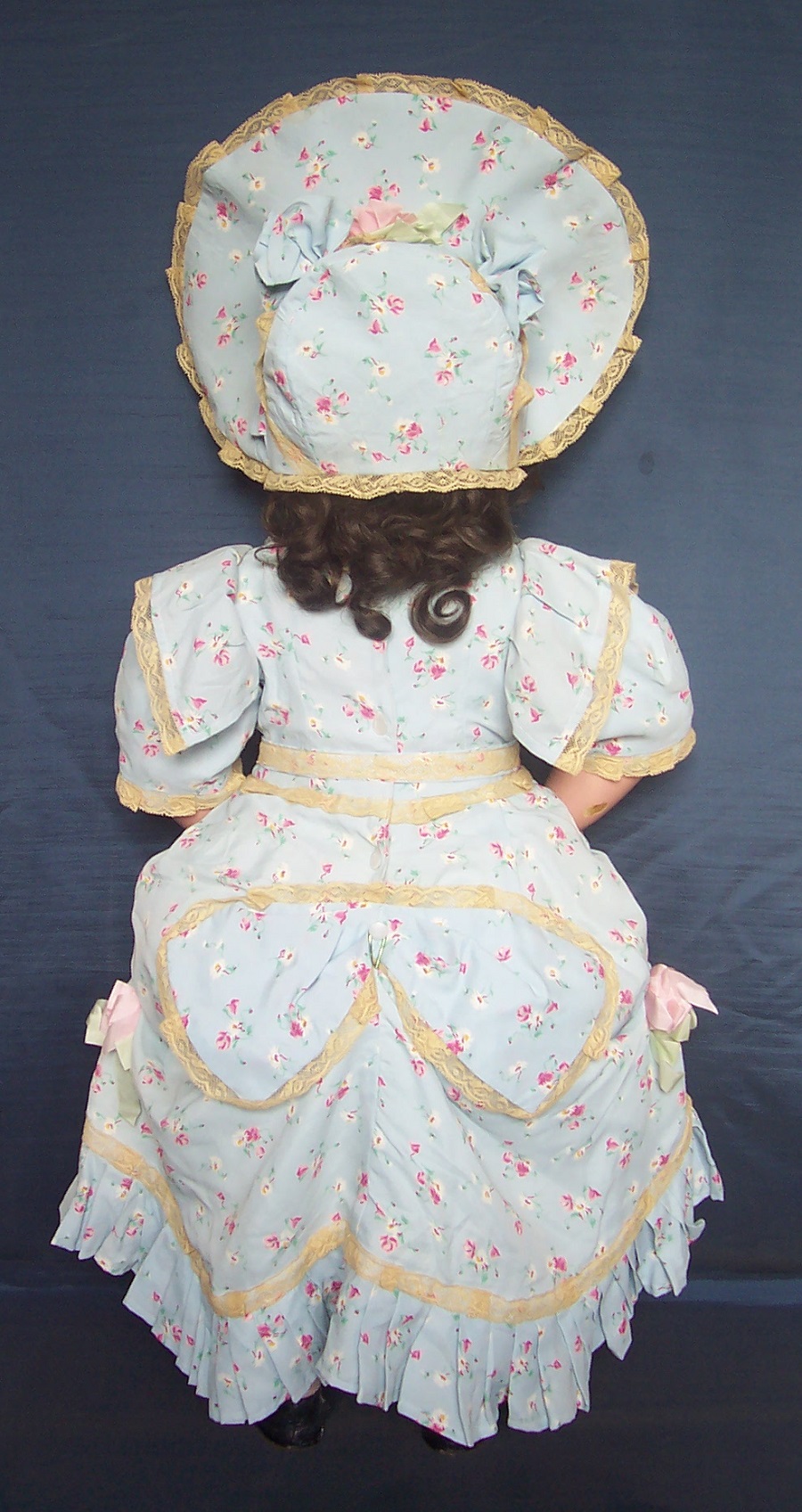 The elaborate outfit is made of an original, antique, light blue silk taffeta