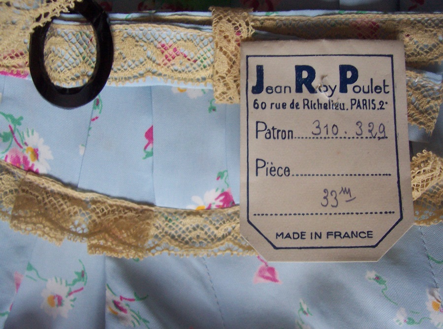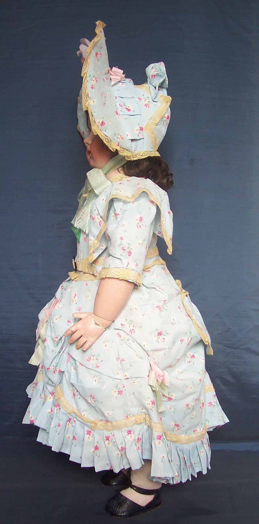 The bonnet is garnished matching to the dress and still trimmed with an ancient pink silk flower.